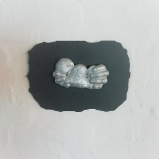 Alluminio puro riciclato, fuso in terra cruda, posto su lastra d'ardesia naturale